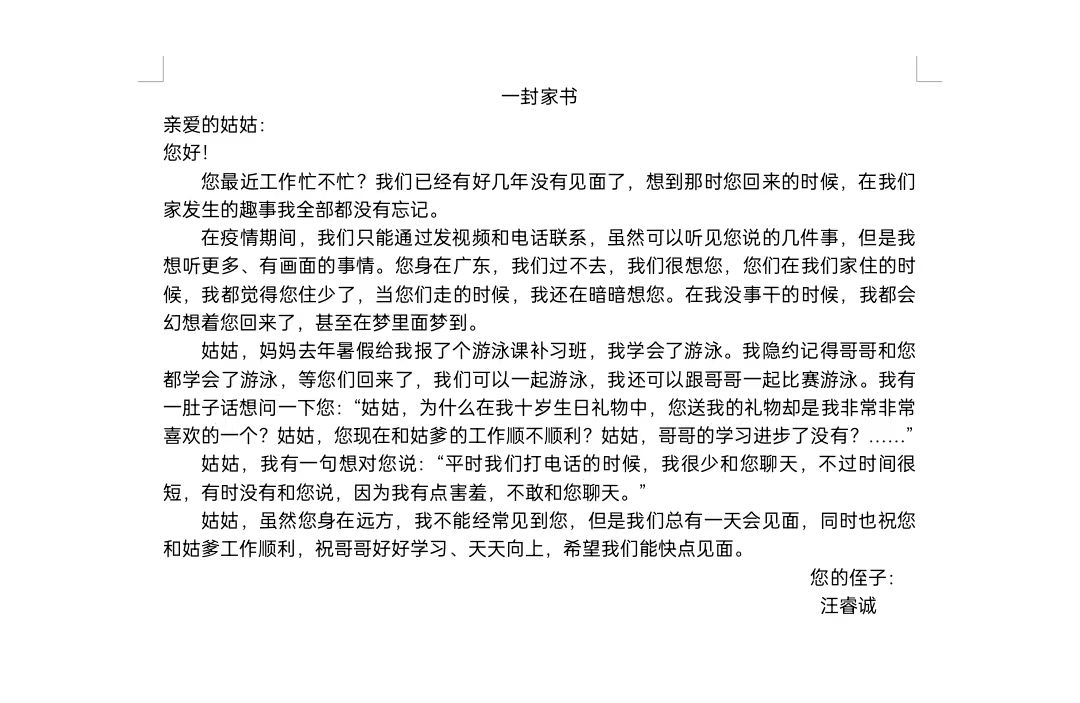 今天,“少年领读者·一封家书”编辑组收到了来自武汉市江夏区实验小学体育馆校区汪睿诚同学写给姑姑的一封家书。