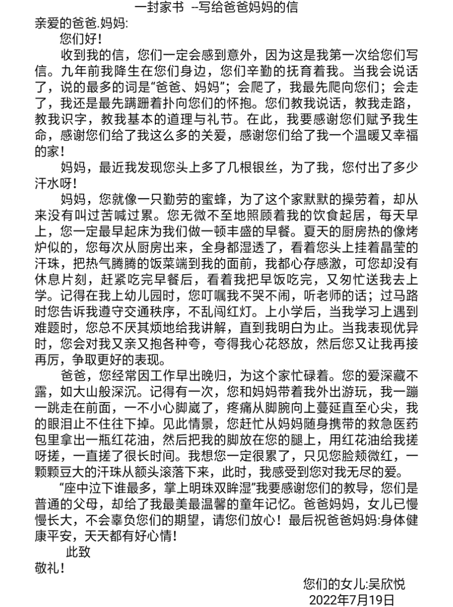 今天,“少年领读者·一封家书”编辑组收到了来自武汉市江夏区大花岭小学三(10)班吴欣悦同学写给爸爸妈妈的一封信。
