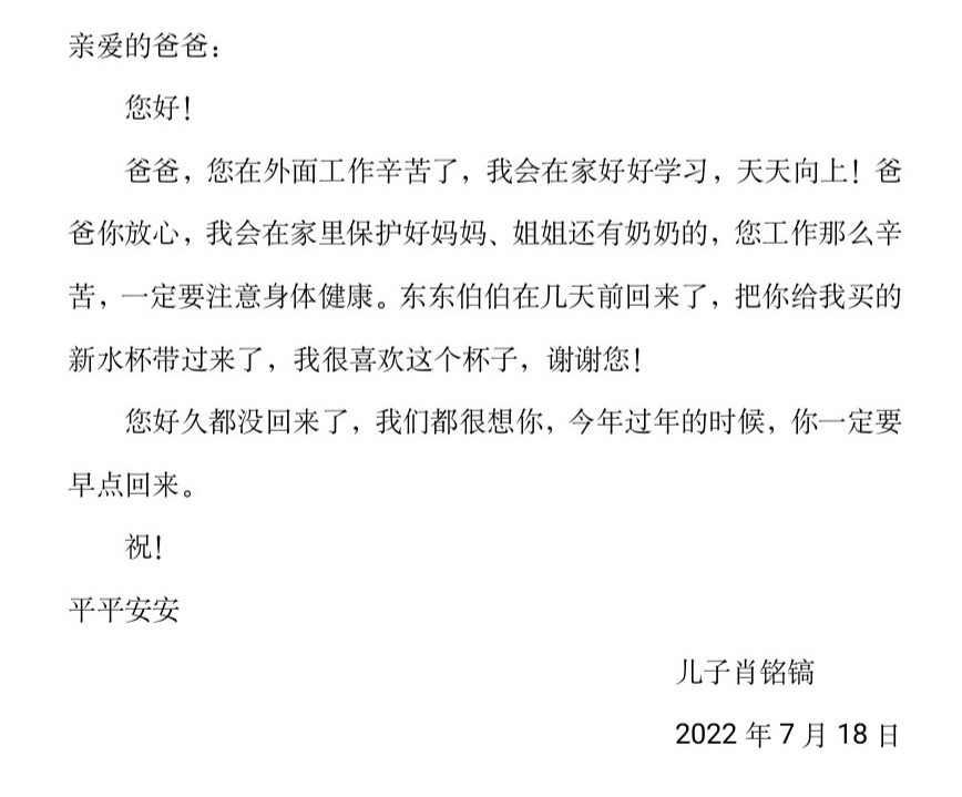 今天,“少年领读者·一封家书”编辑组收到了来自武汉市江夏区实验小学肖铭镐同学写给爸爸的一封家书。