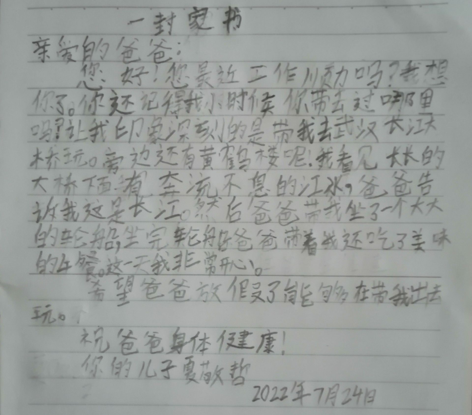 今天,“少年领读者·一封家书”编辑组收到了来自武汉市江夏区实验小学夏敬哲同学写给爸爸的一封家书。