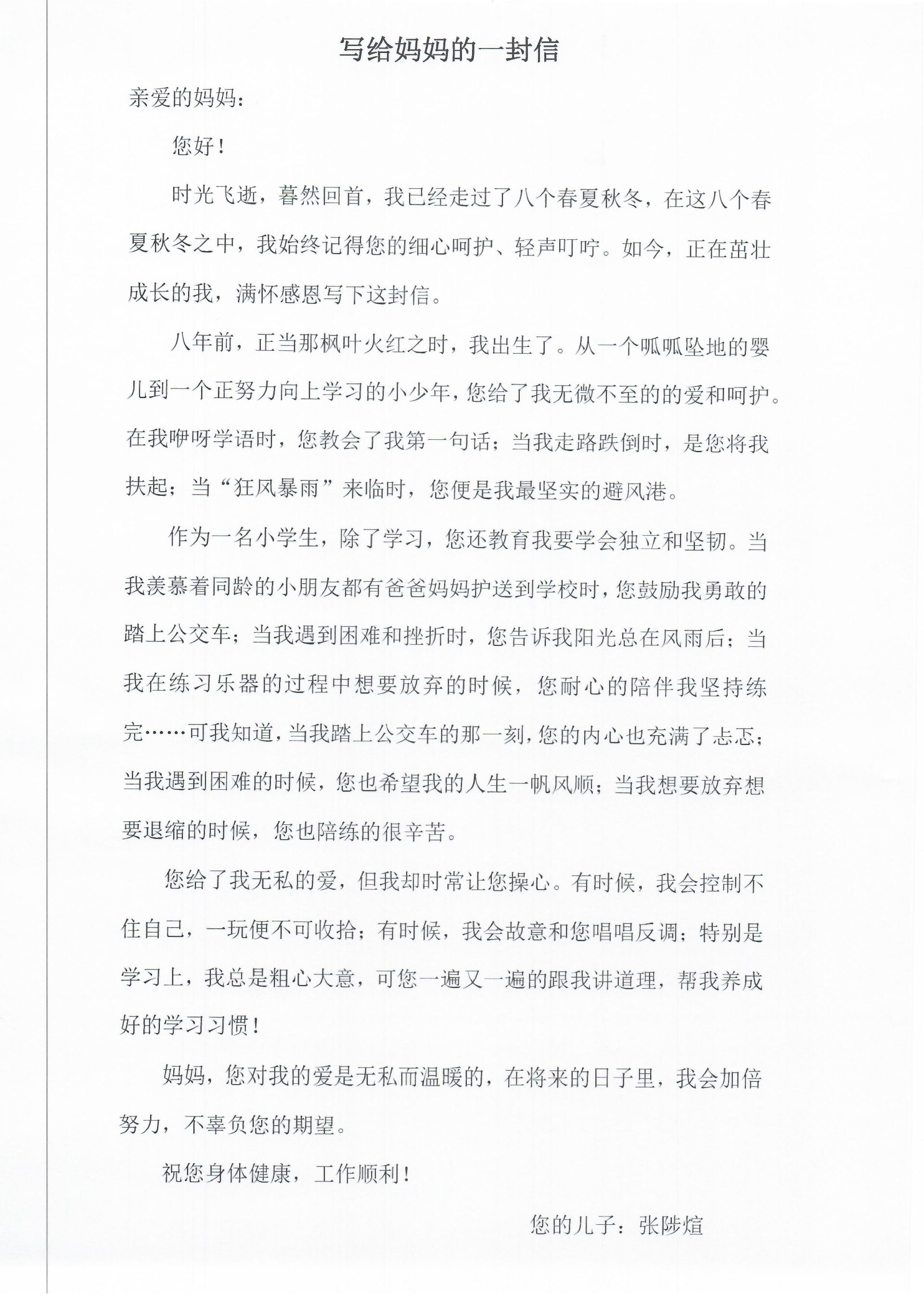 今天,“少年领读者·一封家书”编辑组收到了来自武汉市藏龙小学二九班张陟煊同学写给妈妈的一封信。