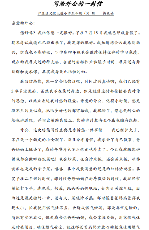 今天,“少年领读者·一封家书”编辑组收到了来自武汉市江夏区文化大道小学三年级(3)班梅亚楠同学写给外公的一封信。