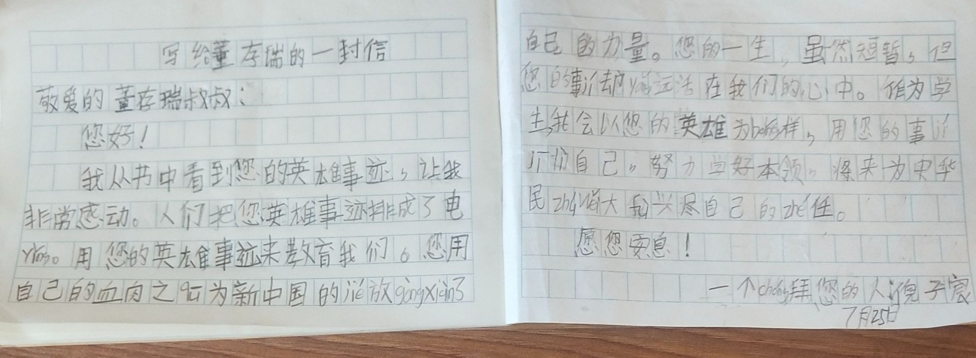 今天,“少年领读者·一封家书”编辑组收到了来自武汉市江夏区实验小学体育馆校区一七班倪子宸同学写给董存瑞的一封信。
