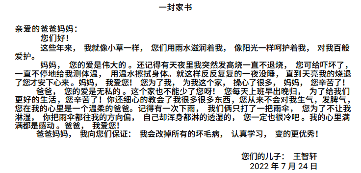 今天,“少年领读者·一封家书”编辑组收到了来自武汉市江夏区文化路小学王智轩同学写给爸爸妈妈的一封家书。