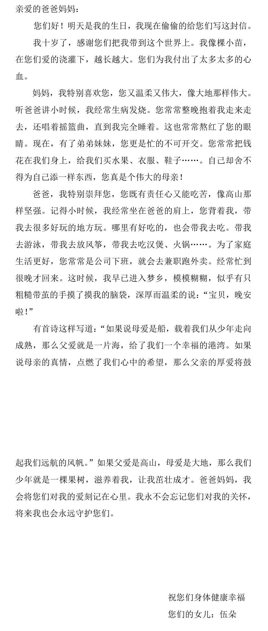 今天,“少年领读者·一封家书”编辑组收到了来自武汉市藏龙小学三八班伍朵同学写给亲爱的爸爸妈妈的一封信。