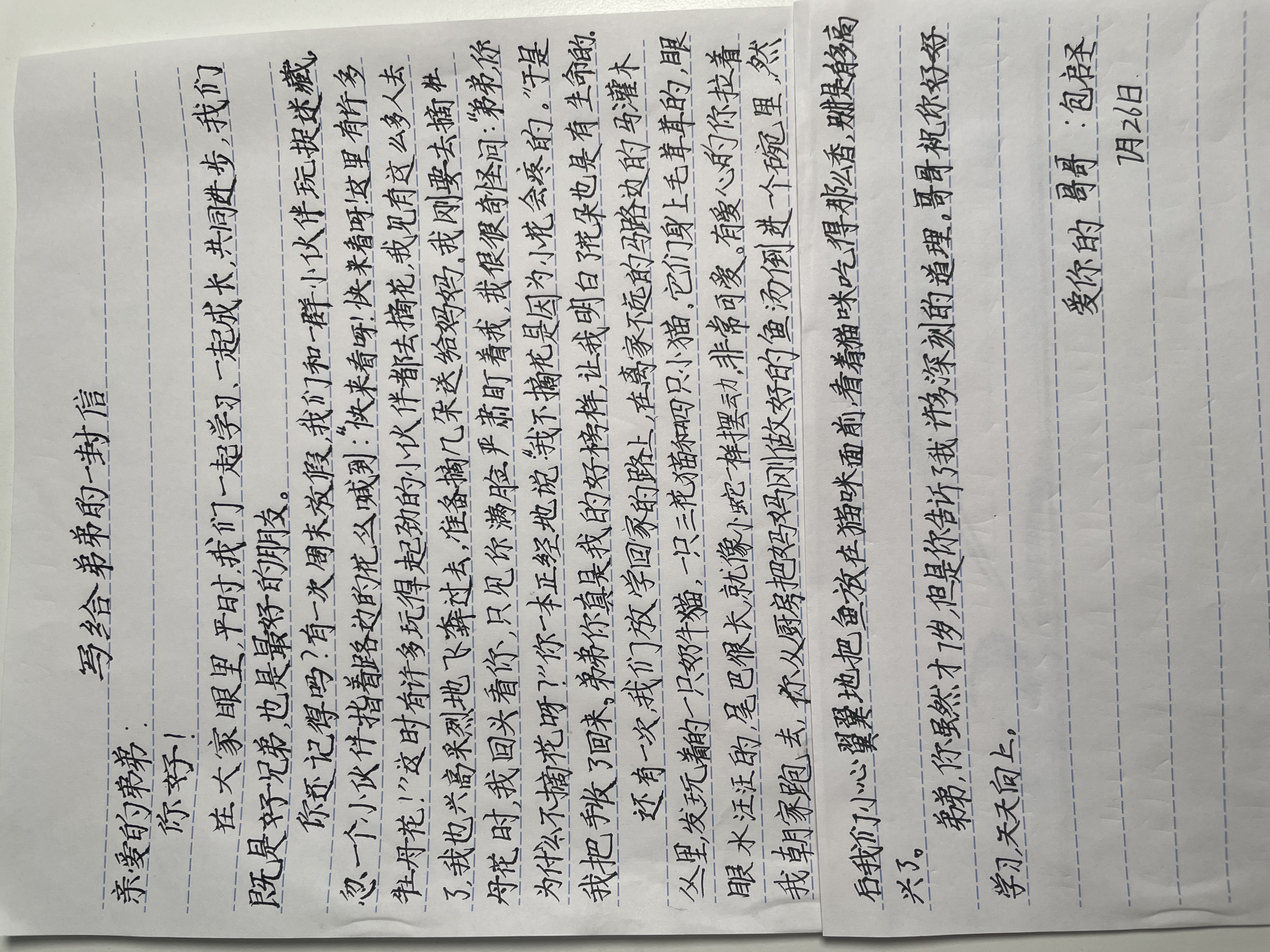 今天,“少年领读者·一封家书”编辑组收到了来自武汉市江夏区实验小学体育馆校区包启圣同学写给弟弟的一封信。