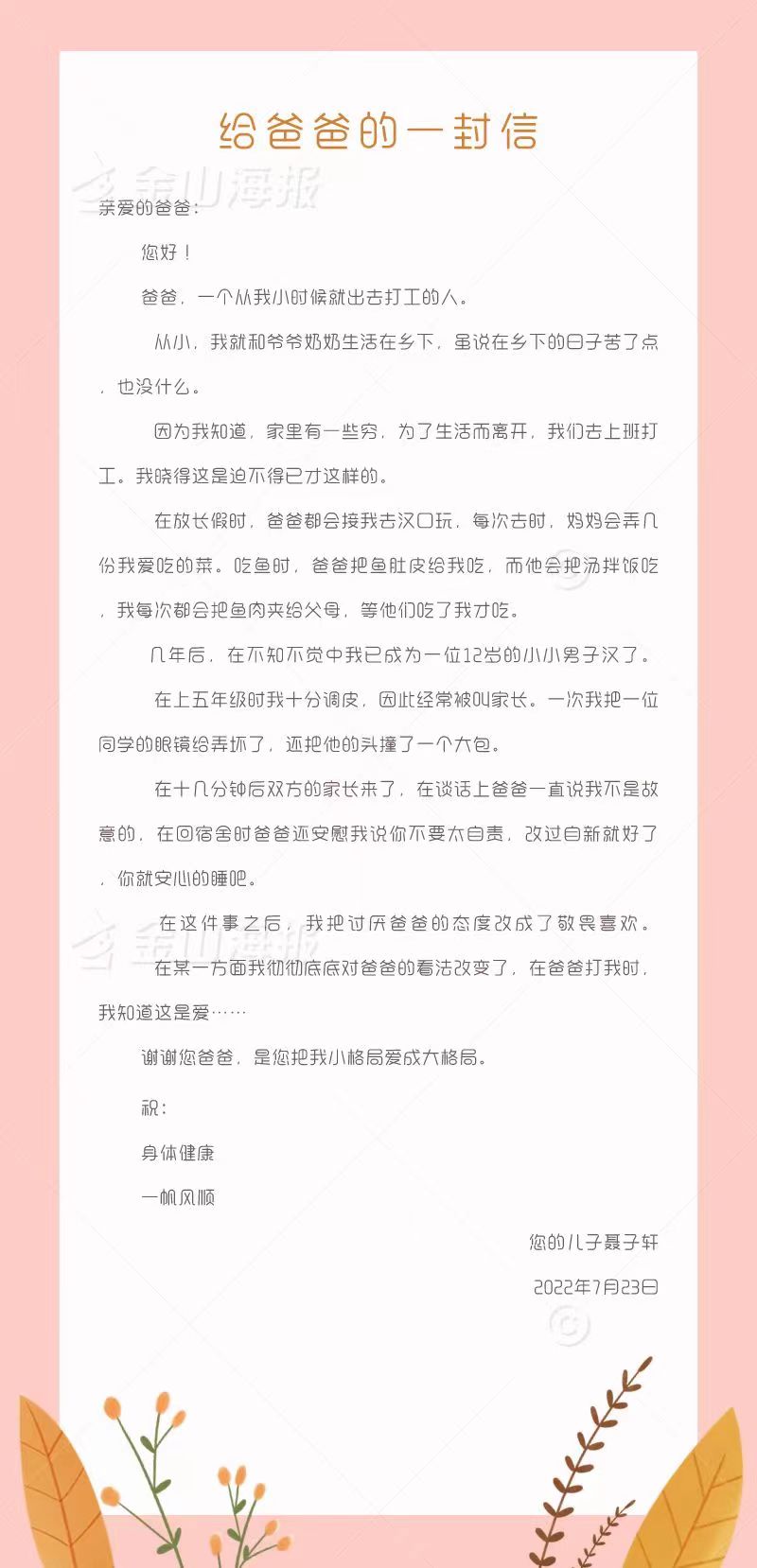 今天,“少年领读者·一封家书”编辑组收到了来自武汉市江夏区金口街长山小学王智华同学写给爸爸的一封信。
