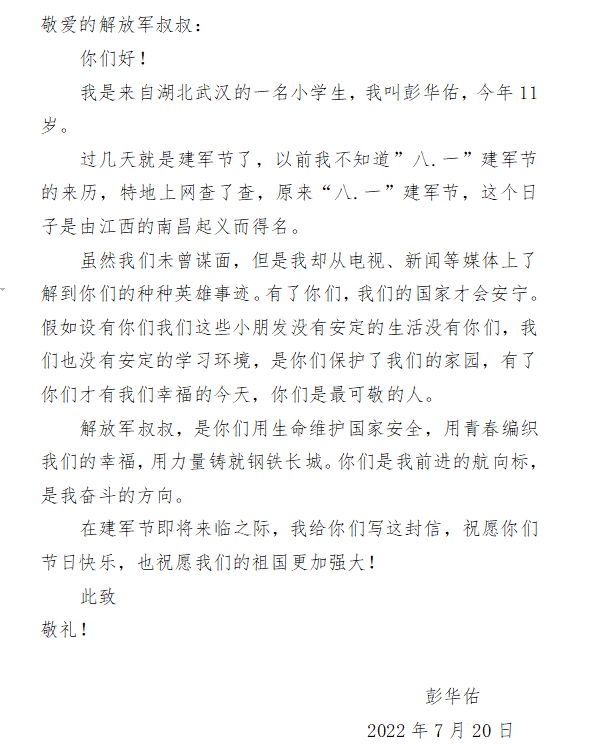 今天,“少年领读者·一封家书”编辑组收到了来自武汉市江夏区实验小学彭华佑同学写给解放叔叔的一封信。