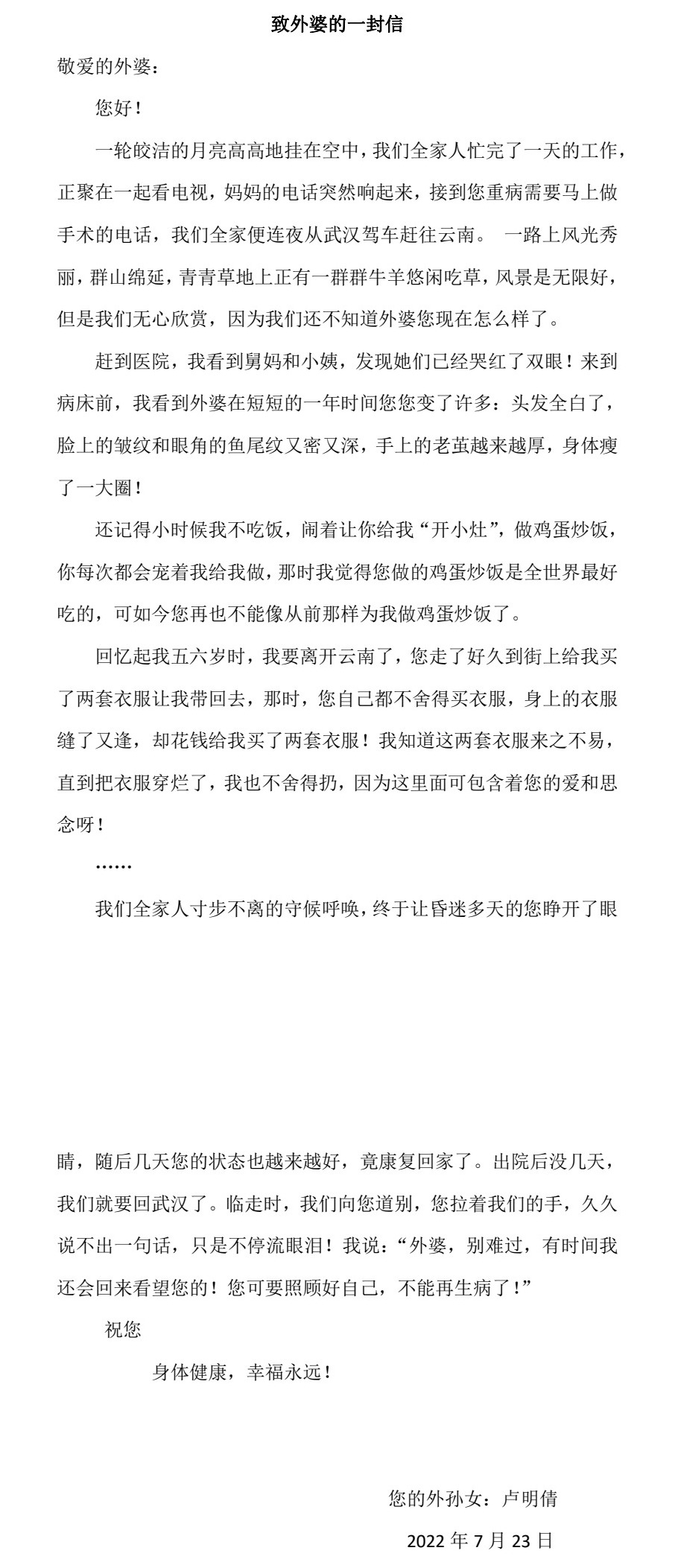 今天,“少年领读者·一封家书”编辑组收到了来自武汉市江夏区金口街长山小学卢明倩同学写给外婆的一封信。