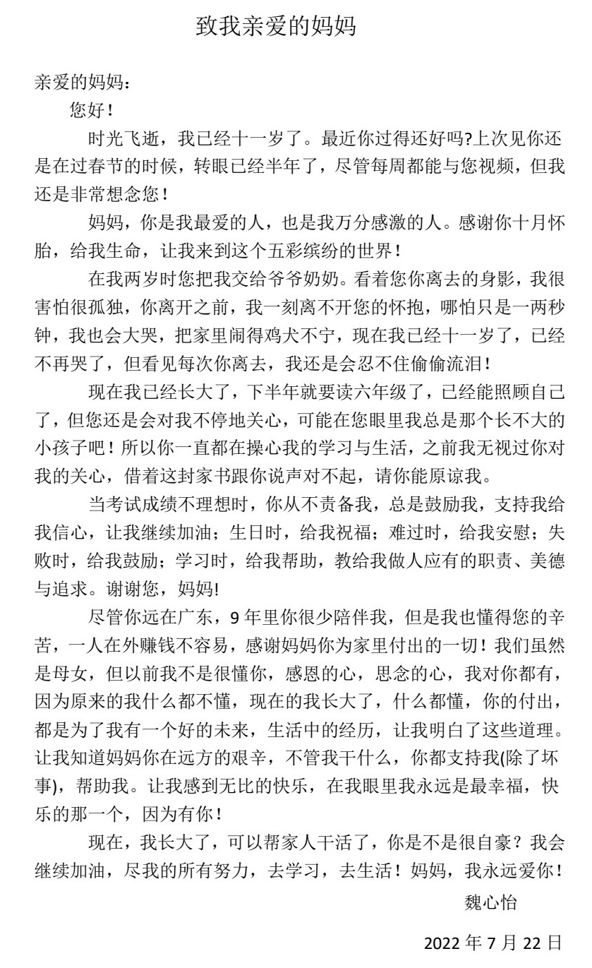 今天,“少年领读者·一封家书”编辑组收到了来自武汉市江夏区金口街长山小学魏心怡同学写给妈妈的一封信。