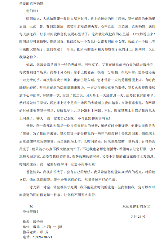 今天,“少年领读者·一封家书”编辑组收到了来自武汉市江夏区藏龙第二小学游怡萱同学写给爸爸妈妈的一封信。