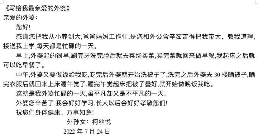 今天,“少年领读者·一封家书”编辑组收到了来自武汉市江夏区实验小学(体育馆校区)柯丝悦同学写给外婆的一封信。