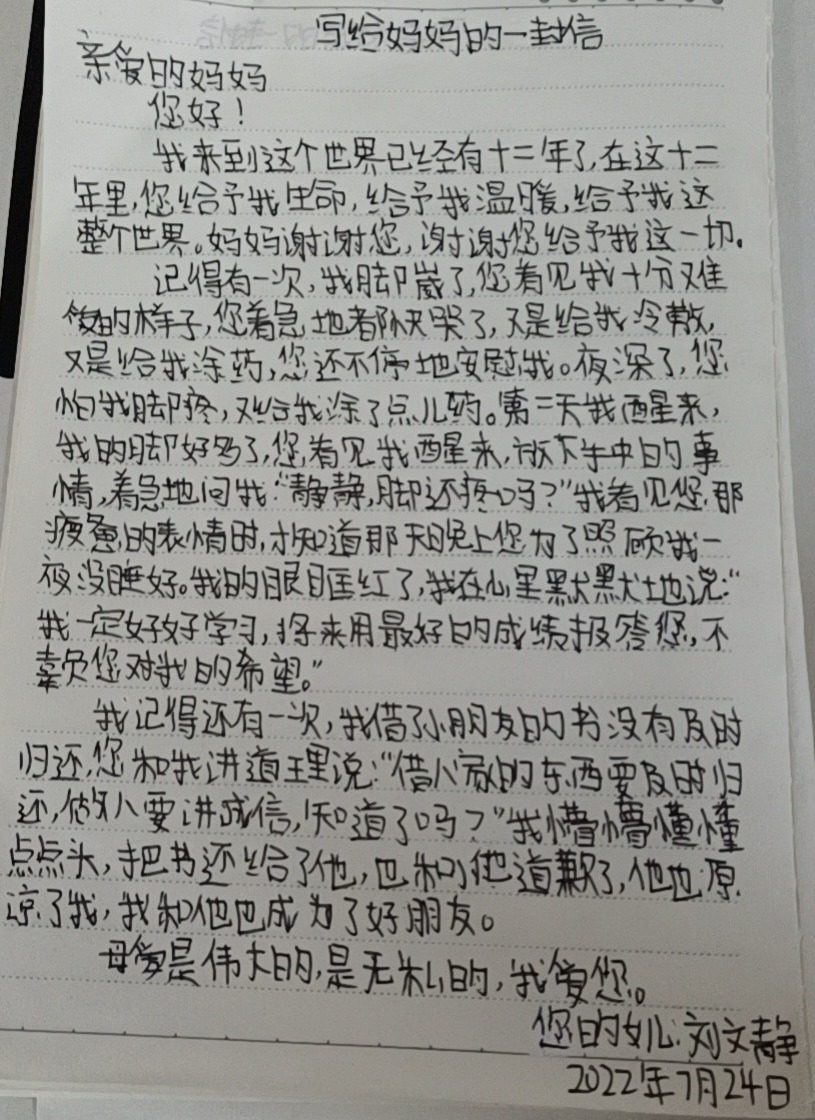 今天,“少年领读者·一封家书”编辑组收到了来自武汉市金口街道范湖小学刘文静同学写给妈妈的一封信。