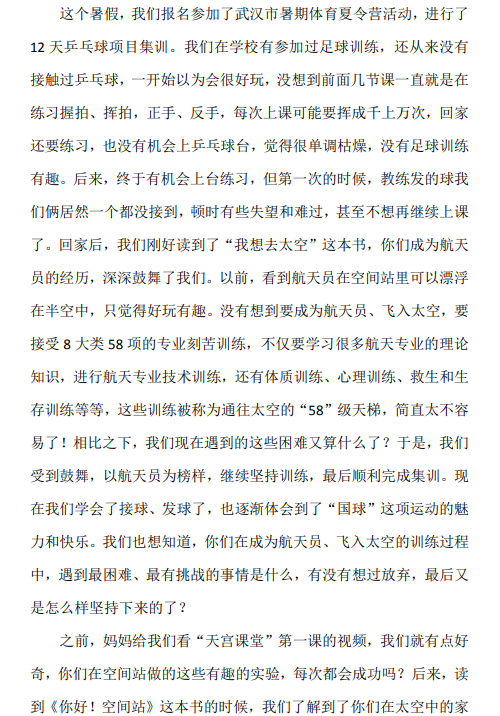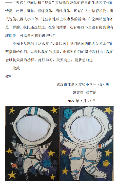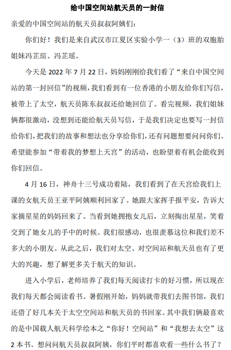 今天,“少年领读者·一封家书”编辑组收到了来自武汉市江夏区实验小学体育馆校区冯芷瑄冯芷瑶同学写给航天员的一封信。