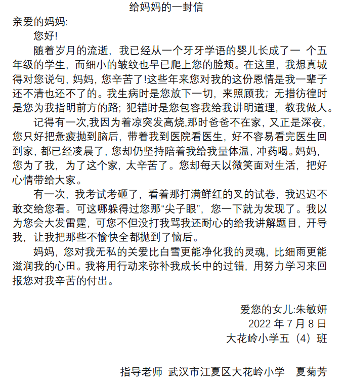 今天,“少年领读者·一封家书”编辑组收到了来自武汉市江夏区大花岭小学朱敏妍同学写给妈妈的一封信。