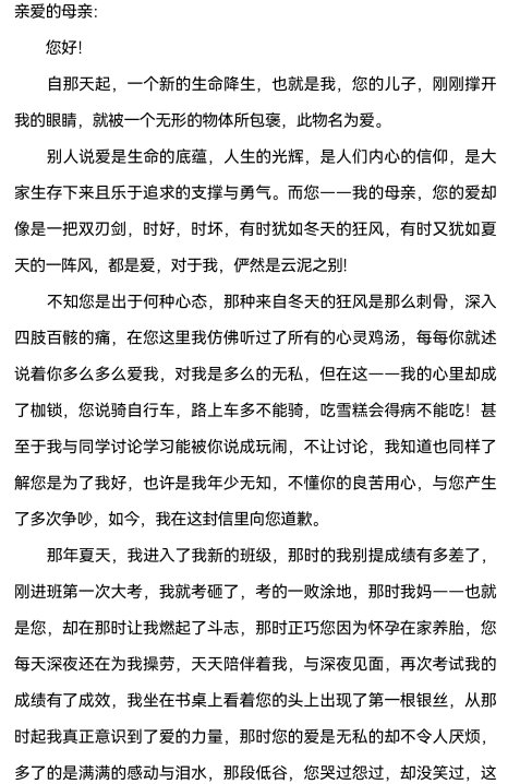 今天,“少年领读者·一封家书”编辑组收到了来自武汉市汉铁初级中学何梓轩同学写给母亲的一封信。