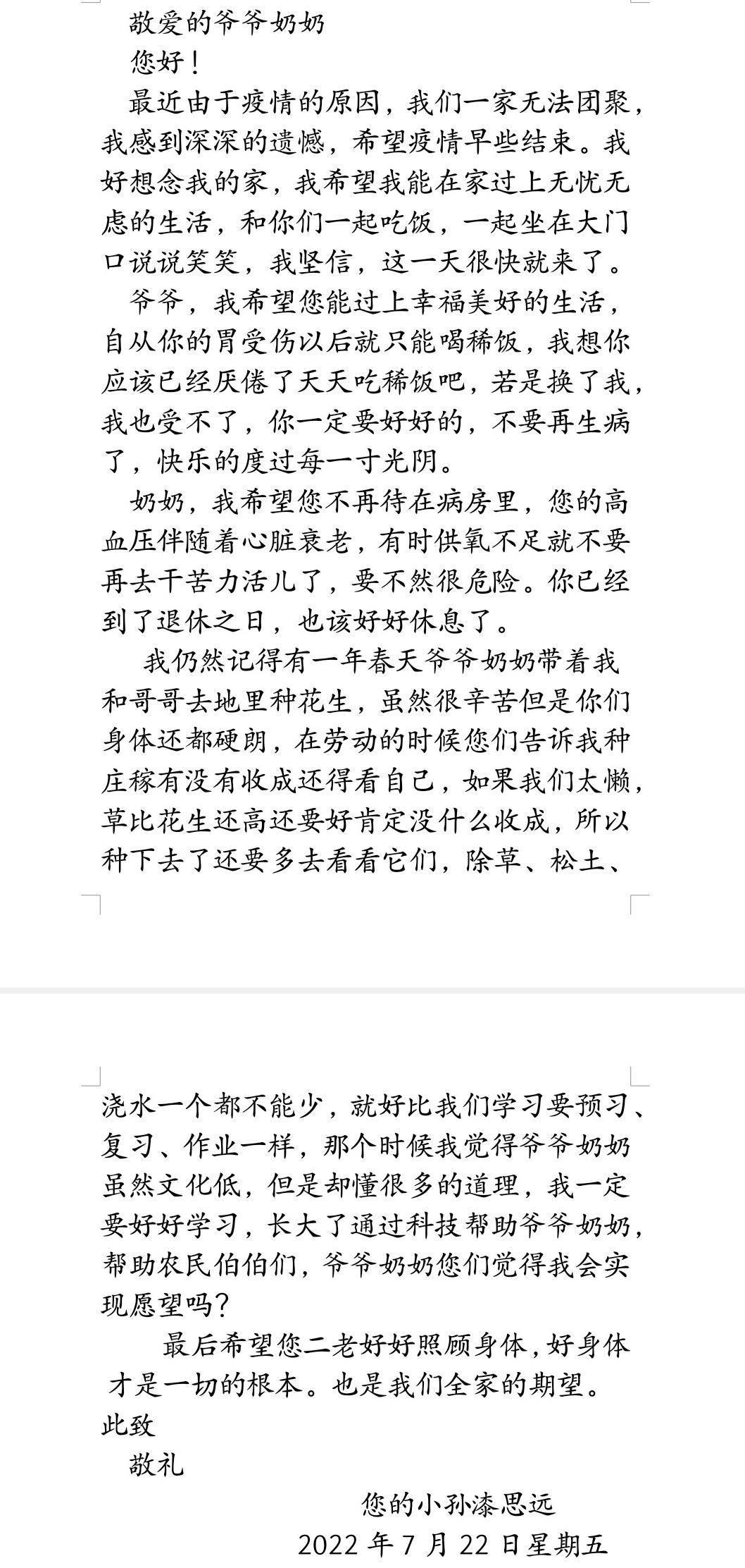 今天,“少年领读者·一封家书”编辑组收到了来自武汉市江夏区藏龙小学三四班漆思远同学写给爷爷奶奶的一封信。