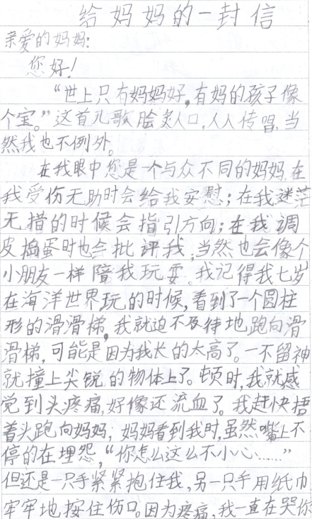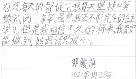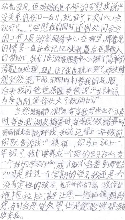 今天,“少年领读者·一封家书”编辑组收到了来自武汉市江夏区大花岭小学的邹骏祺同学写给妈妈的一封信。