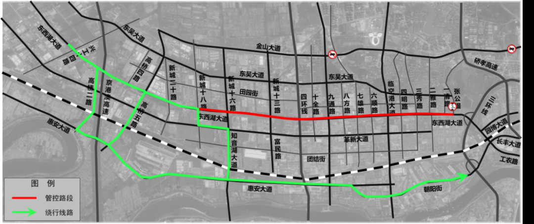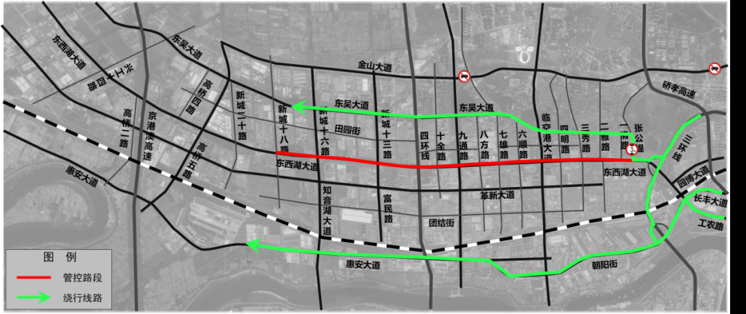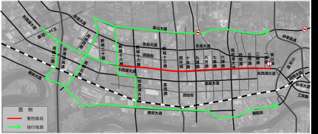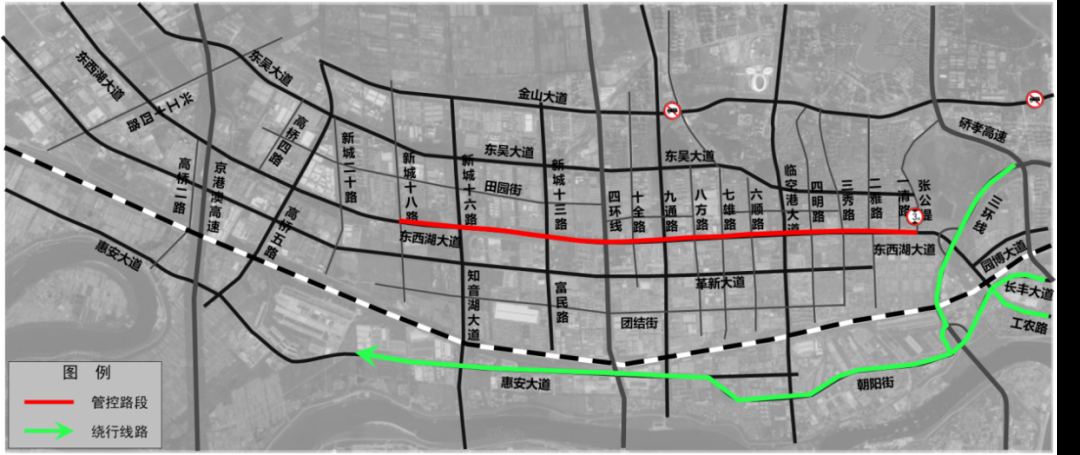 (一)由东向西方向原市内经东西湖大道前往东西湖区方向的载客汽车可绕行三环线、工农路、长丰大道、张公堤(限高3米)、东吴大道、朝阳街、惠安大道等周边道路。
