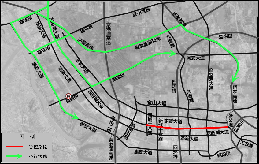 (二)由西向东方向东西湖区经东西湖大道前往市内方向的载客汽车、载货汽车可绕行惠安大道、走新路、沪蓉高速、武汉绕城高速、硚孝高速等周边道路。