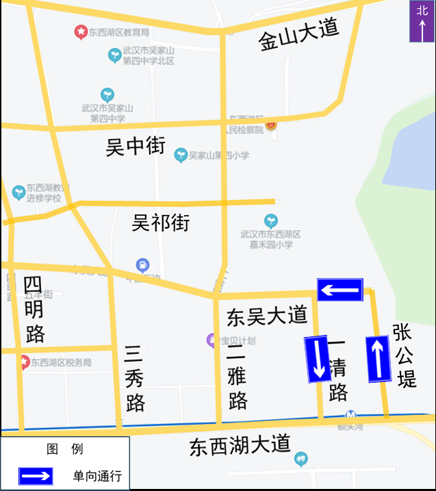 三、为改善吴家山城区绕行条件,打通张公堤至东吴大道,张公堤路(东西湖大道至东吴大道)、东吴大道(张公堤至一清路)、一清路(东吴大道至东西湖大道)形成单向微循环。