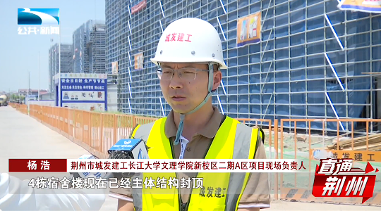 荆州市城发建工长江大学文理学院新校区二期A区项目现场负责人 杨浩:“我们现场有5栋建筑,4栋宿舍楼现在已经主体结构封顶,食堂预计在7月底可以全部封顶。现在我们封顶之后正在穿插的是砌体施工和我们的装修作业,预计A区应该在9月底到10月中旬的样子,所有装修可以全部做完。”