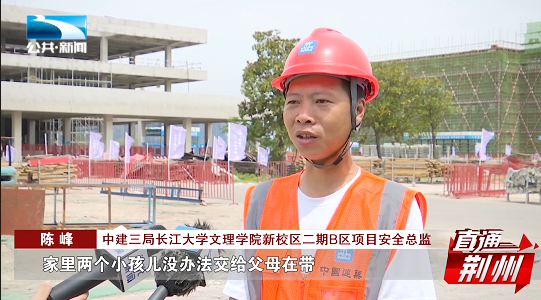 中建三局长江大学文理学院新校区二期B区项目安全总监 陈峰:“家里两个小孩儿没办法交给父母在带,这个项目要到今年年底才能交付使用,我跟我老婆两个可能只能到那个时候,才能回家看小孩和父母。为了荆州大学城的建设,我们的付出是有意义的。”