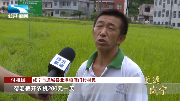 咸宁市通城县北港镇雁门村村民 付祖国:“(灭荒公司)给23亩田,荒田把它整平了,撒了种子给我,只有我管理,是我个人的收入,(有)一两万块钱的收入,帮老板管理,管理费一亩田200多块钱,管理20亩就四千多。把我送去学农机,学成技术之后,技术熟练之后,帮老板开农机200元一天,(年收入)比以往增加两三万块钱。”