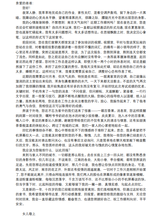 今天,“少年领读者·一封家书”编辑组收到了来自武汉市汉铁初级中学胡欣妍同学写给爸爸的一封家书。