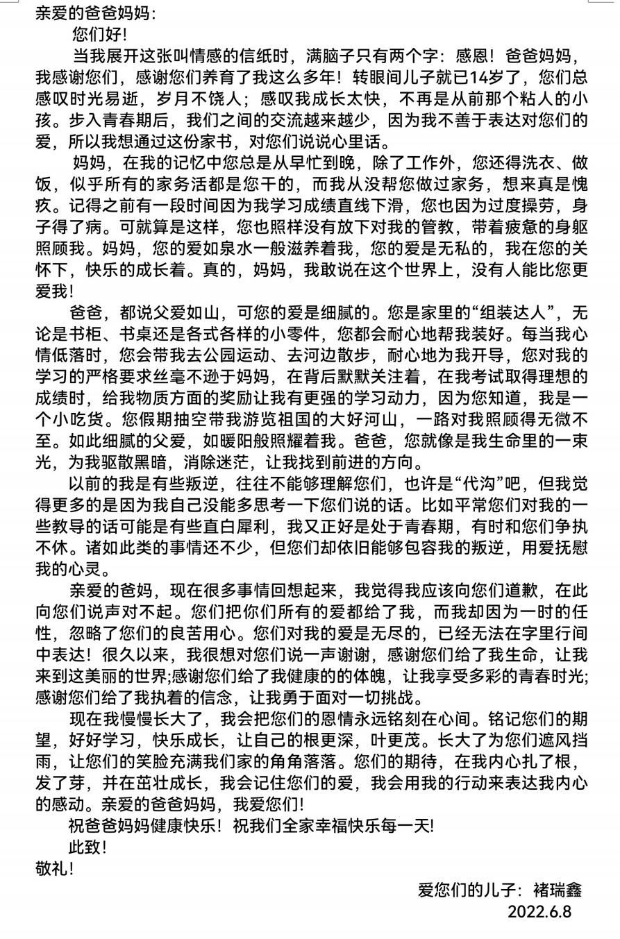 今天,“少年领读者·一封家书”编辑组收到了来自武汉市汉铁初级中学褚瑞鑫同学写给爸爸妈妈的一封家书。