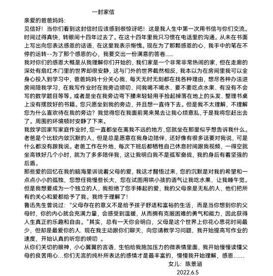 今天,“少年领读者·一封家书”编辑组收到了来自武汉市汉铁初级中学陈景涵同学写给妈妈的一封家书。