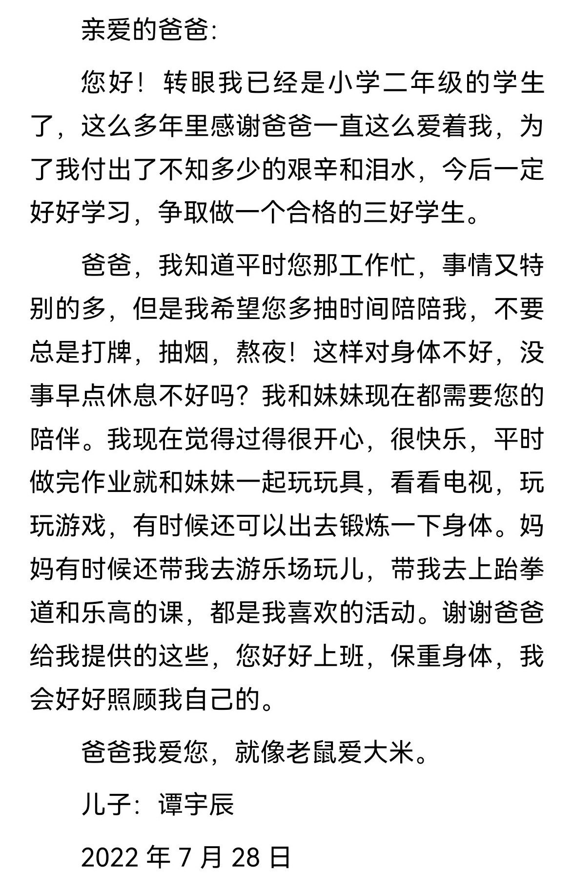 今天,“少年领读者·一封家书”编辑组收到了来自武汉市海淀外国语实验学校谭宇辰同学写给爸爸的一封信。
