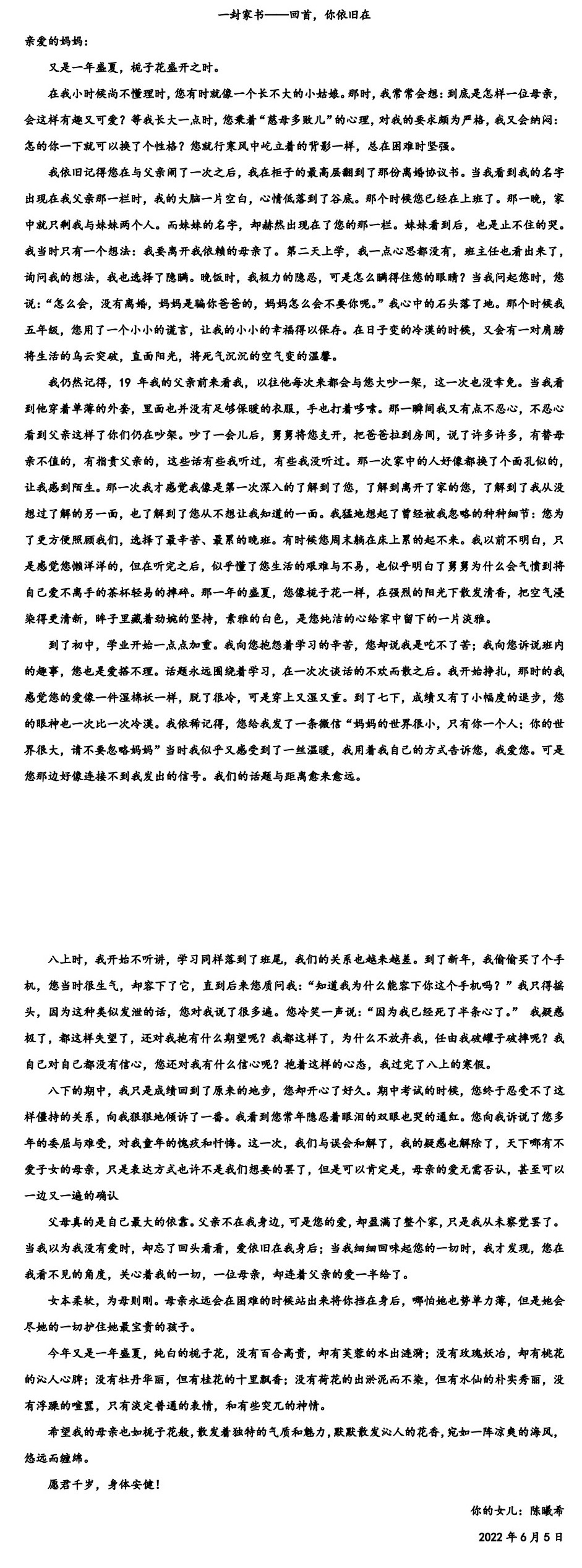 今天,“少年领读者·一封家书”编辑组收到了来自武汉市汉铁初级中学陈曦希同学写给妈妈的一封家书。