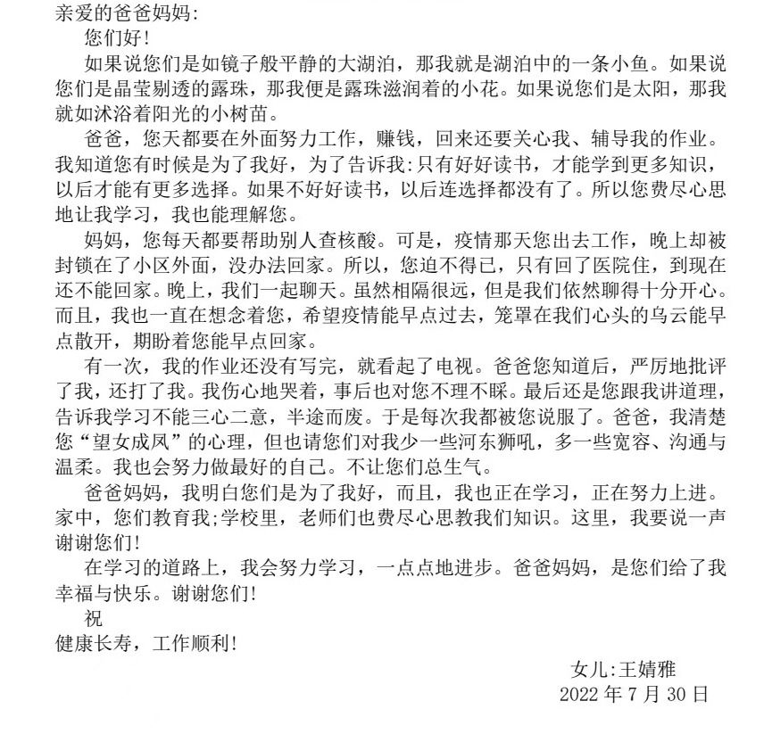 今天,“少年领读者·一封家书”编辑组收到了来自武汉市江夏区实验小学王婧雅同学的一封家书。