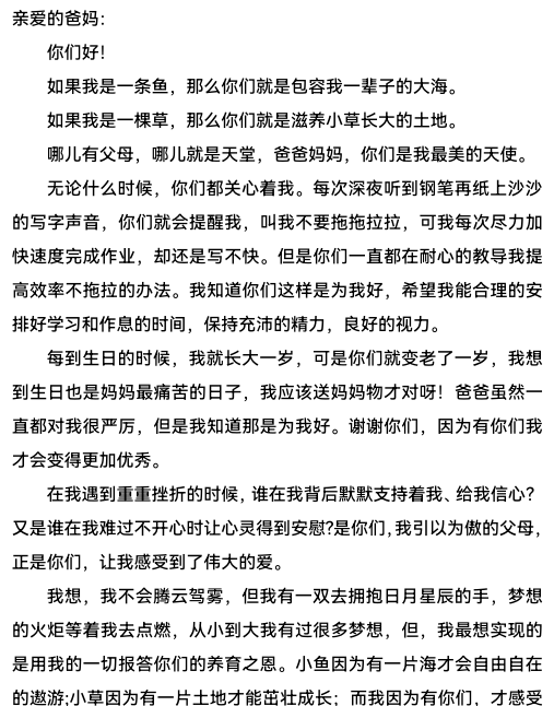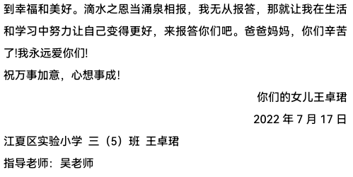 今天,“少年领读者·一封家书”编辑组收到了来自武汉市江夏区实验小学王卓珺同学的一封家书。