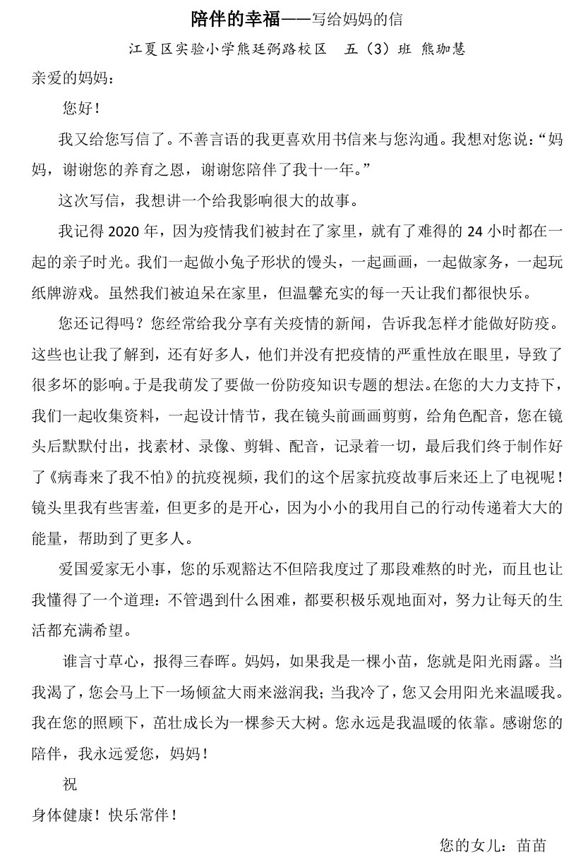 今天,“少年领读者·一封家书”编辑组收到了来自武汉市江夏区实验小学熊廷弼校区五(3)班熊珈慧同学的一封家书。
