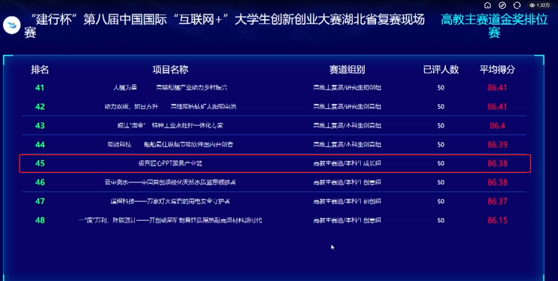 在高教主赛道金奖排位赛中,武昌理工学院极客匠心团队项目力抗诸多名校的优秀项目,获得了第45名的好成绩。负责人容欢龙创办的武汉市极客匠心网络科技有限公司,总办公面积600余平方米,是一家以“幻灯片演示”为核心的技术开发及设计应用服务商。目前该公司已拥有业内20余名顶尖演示设计师和技术培训师,公司自主研发幻灯片辅助设计系统获得15项软件著作权。4年来为国家税务总局、国家电网、武汉理工大学、合肥工业大学、广东海洋大学等全国千余家客户提供超过30万页幻灯片演示设计服务,为百余所高校和企业开展演示技术培训200余场,参与人次超10万人。