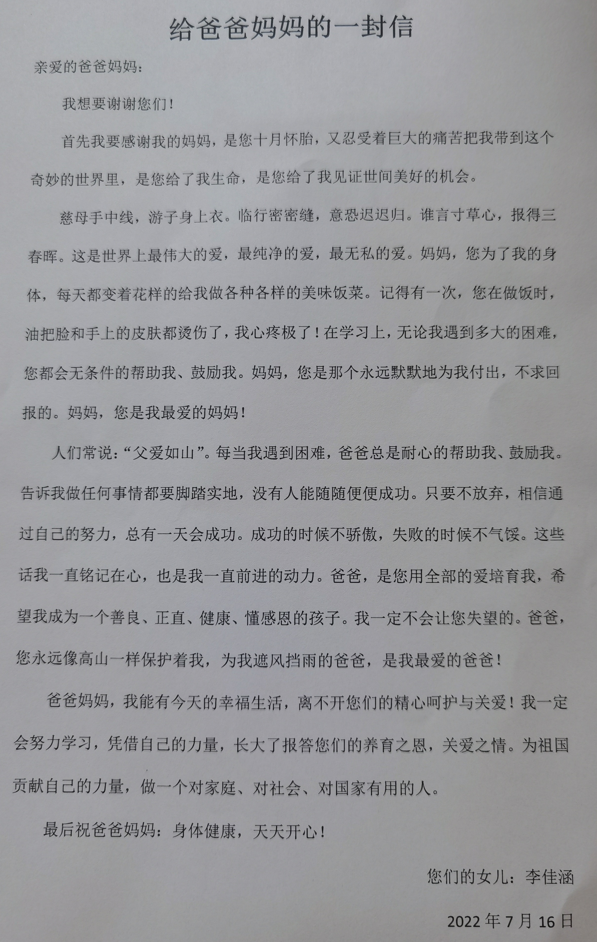 今天,“少年领读者·一封家书”编辑组收到了来自武汉市江夏区金口小学李佳涵同学的一封信。
