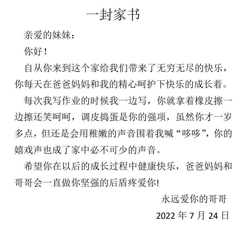 今天,“少年领读者·一封家书”编辑组收到了来自武汉市江夏区实验小学体育馆校区一(七)班郑昊楠同学的一封家书。
