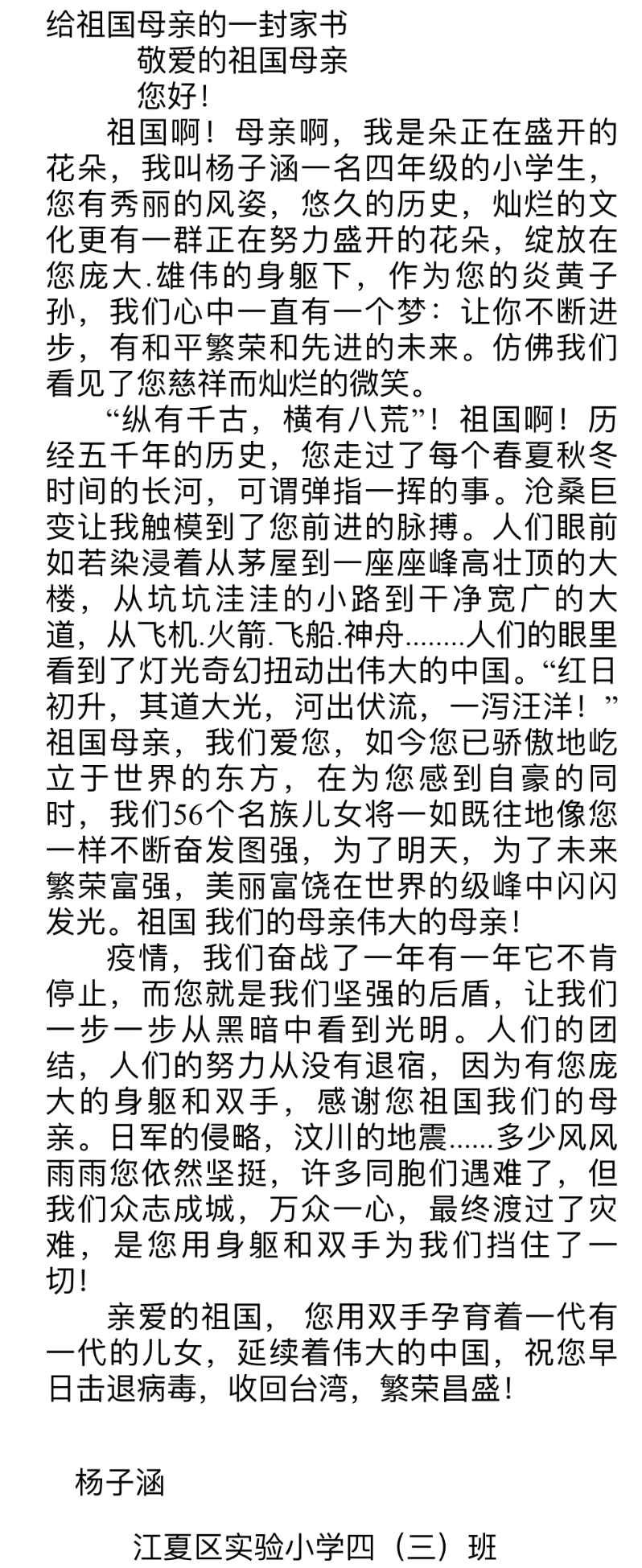 今天,“少年领读者·一封家书”编辑组收到了来自武汉市江夏区实验小学体育馆校区四三班杨子涵同学的一封家书。