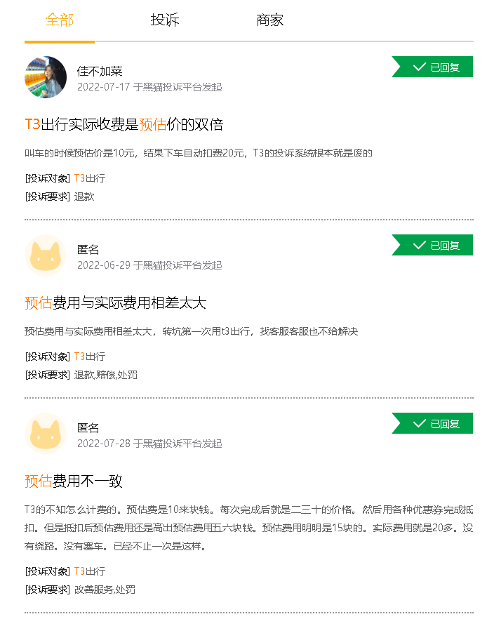 网络平台上有不少针对“T3出行”计费问题的投诉