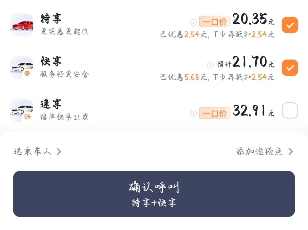 记者打开“T3出行”APP,输入吴女士的上班路线后看到,页面显示“特享”“快享”“速享”三种车型,预估价分别为20.35元、21.70元、32.91元,其中“特享”“速享”标注为“一口价”,均与吴女士实付的40.74元相差较大。