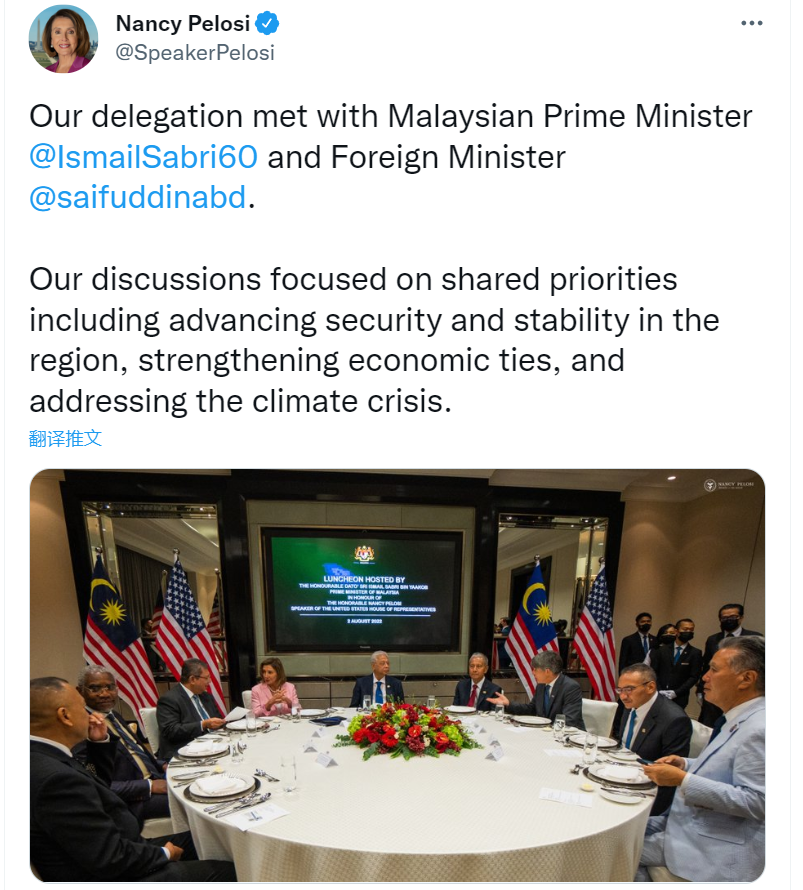 佩洛西发推声称,“我们的代表团会见了马来西亚总理伊斯梅尔·萨布里和外交部部长赛夫丁。我们的讨论集中在共同的优先事项上,包括促进该地区安全与稳定、加强经济联系以及应对气候危机。”推文还配上她与马来西亚高官会晤的照片。