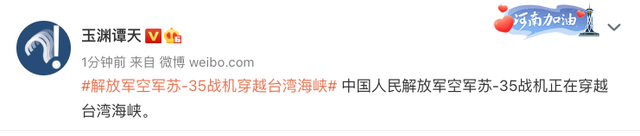 据玉渊潭天最新消息,中国人民解放军空军苏-35战机正在穿越台湾海峡。