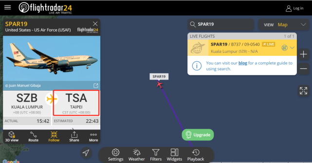 根据飞行航班信息平台FlightRadar24显示,据信是美国众议院议长佩洛西搭乘的C-40C专机(呼号SPAR19)于北京时间8月2日15时42分从吉隆坡的机场起飞,21时25分左右该平台显示出此架飞机目的地:台北,预计到达时间22时43分。