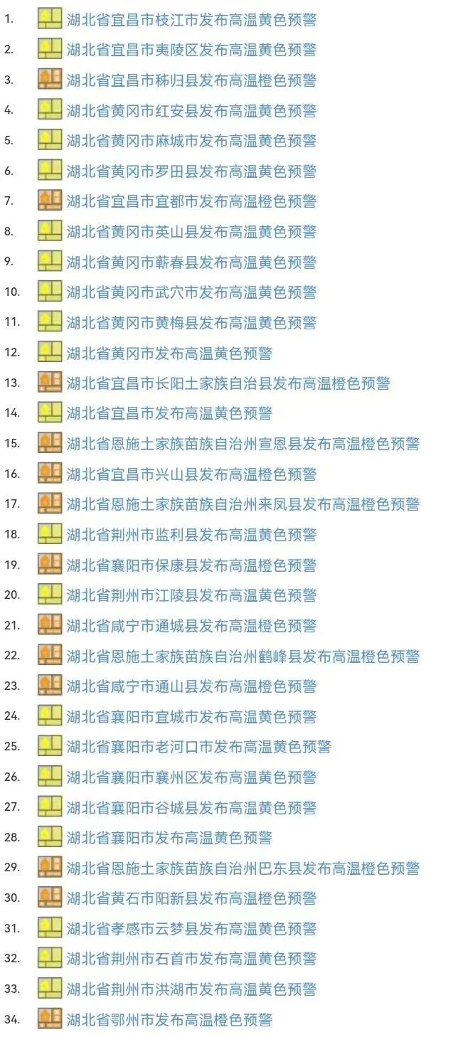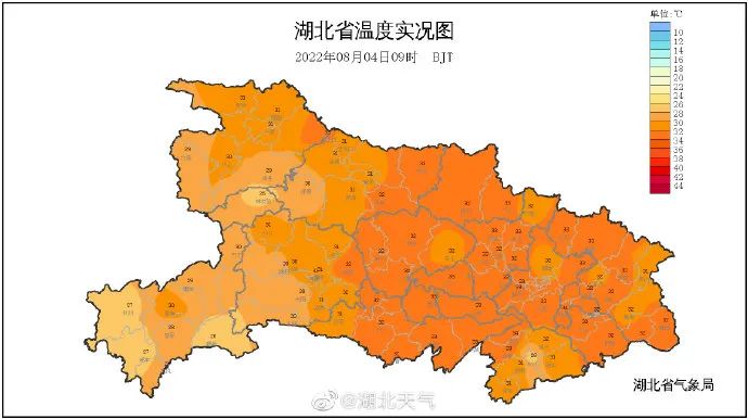 日平均气温:鄂西南29~32℃;其他地区32~35℃