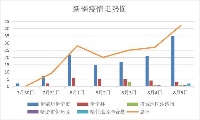 新疆本轮疫情是从7月底开始的。7月30日,新疆维吾尔自治区报告新增无症状感染者2例,在伊犁州伊宁市。8月1日,伊宁市新增感染人数为7例,伊宁县也报告了2例感染。8月3日,尼勒克县也报告了3例新增感染,4日,塔城地区沙湾时也报告了1例新增感染,5日,疫情蔓延至哈密市伊州区和喀什地区泽普县。