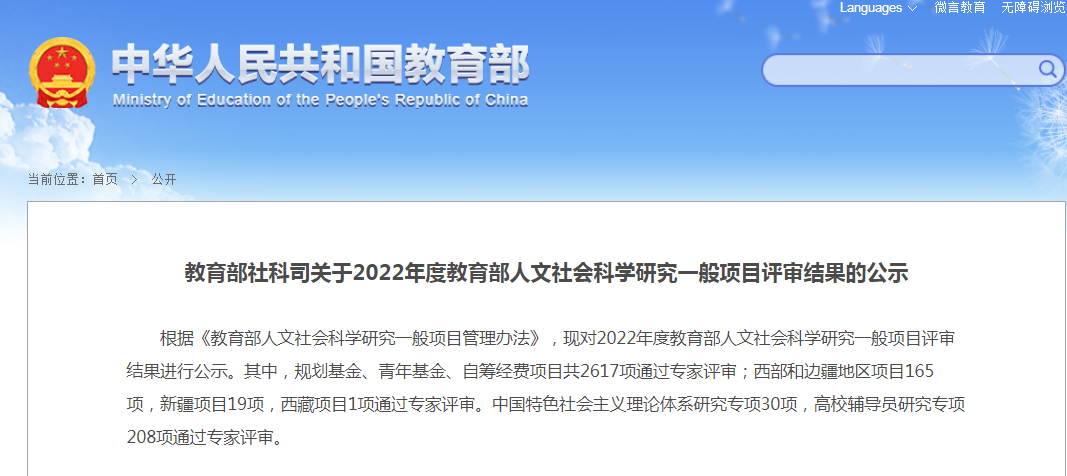 据了解,教育部2022年度规划基金、青年基金、自筹经费项目共2617项通过专家评审;西部和边疆地区项目165项,新疆项目19项,西藏项目1项通过专家评审。中国特色社会主义理论体系研究专项30项,高校辅导员研究专项208项通过专家评审。武昌理工学院是全国同类高校中获批规划基金项目为数不多的高校。