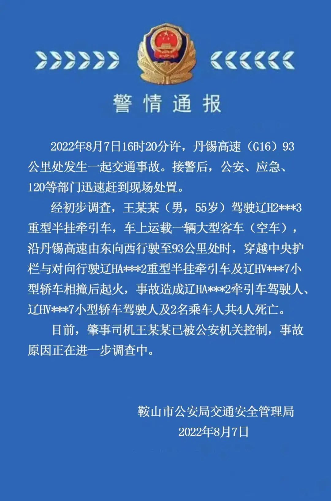 经初步调查,王某某(男,55岁)驾驶辽H2***3重型半挂牵引车,车上运载一辆大型客车(空车),沿丹锡高速由东向西行驶至93公里处时,穿越中央护栏与对向行驶辽HA***2重型半挂牵引车及辽HV***7小型轿车相撞后起火,事故造成辽HA***2牵引车驾驶人、辽HV***7小型轿车驾驶人及2名乘车人共4人死亡。