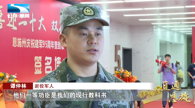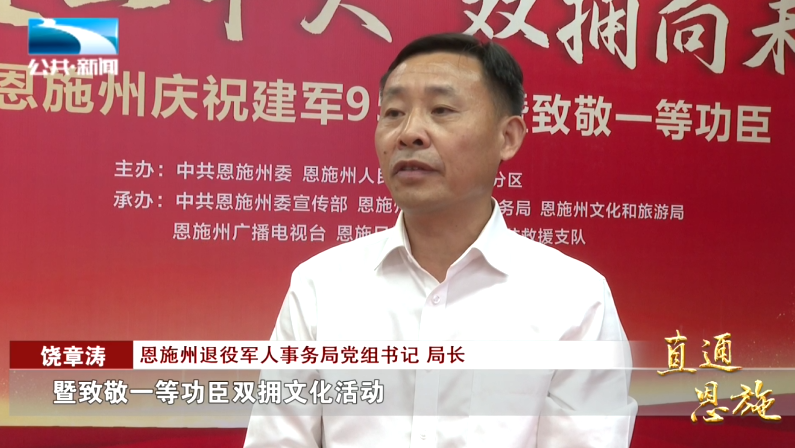 恩施州退役军人事务局党组书记、局长 饶章涛:“举办庆祝建军95周年暨致敬一等功臣双拥文化活动,既是对现役军人戍边卫国、牺牲奉献的致敬,也是对退役军人回归地方、建功新时代的褒扬激励,其目的就是让军人成为全社会尊崇的职业,让退役军人成为全社会尊重的人,让军政军民关系更加团结和谐。”